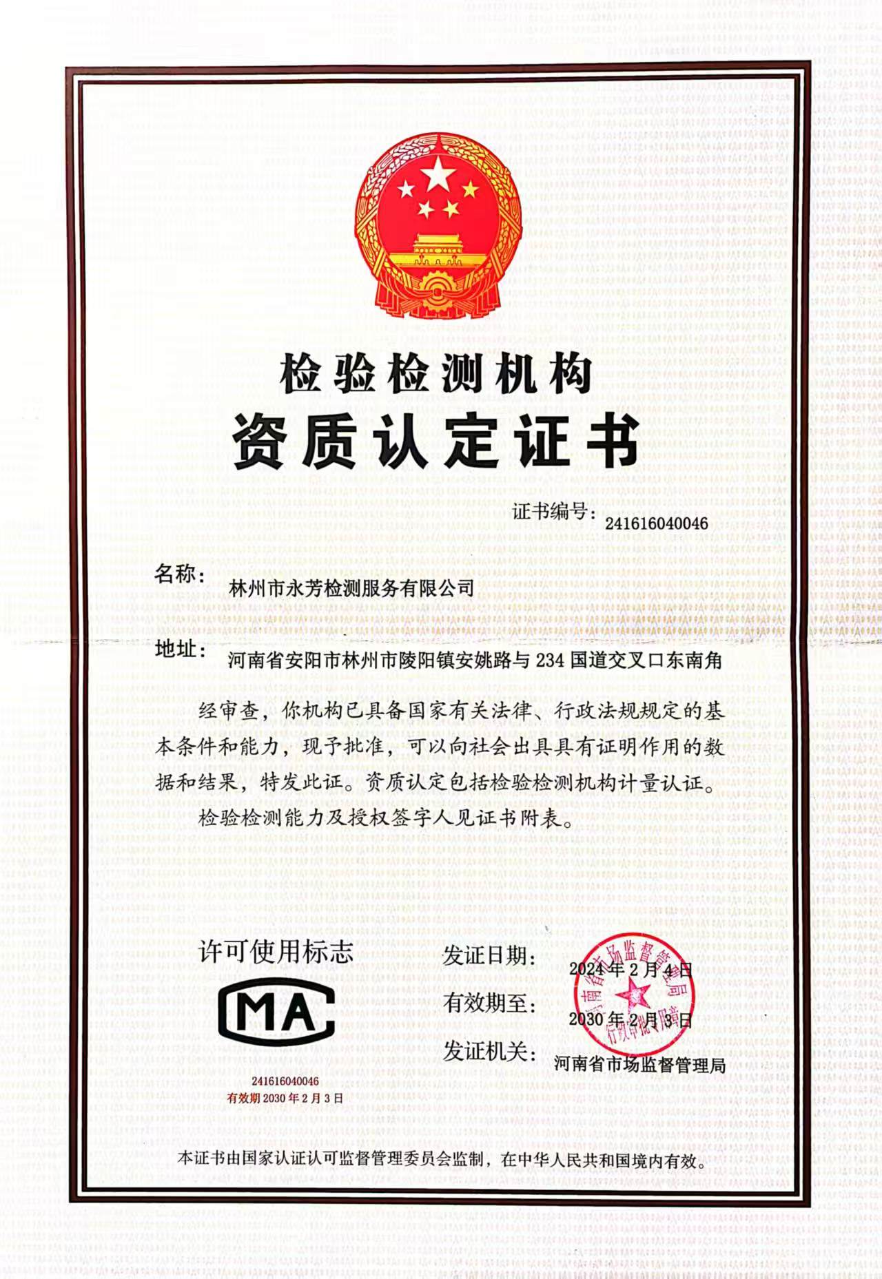 检验检测机构资质认定证书